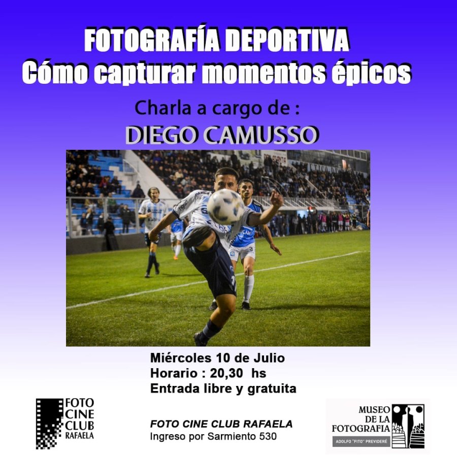 El Foto Cine Club Rafaela anunció la realización de una charla abierta sobre Fotografía Deportiva que se llevará a cabo el miércoles 10 de Julio a las 20:30 horas en la sede del Museo de la Fotografía, calle Sarmiento 530. La misma estará a cargo del fotógrafo Diego Camusso, quien cuenta con 20 años de experiencia en la fotografía deportiva y fotoperiodismo.