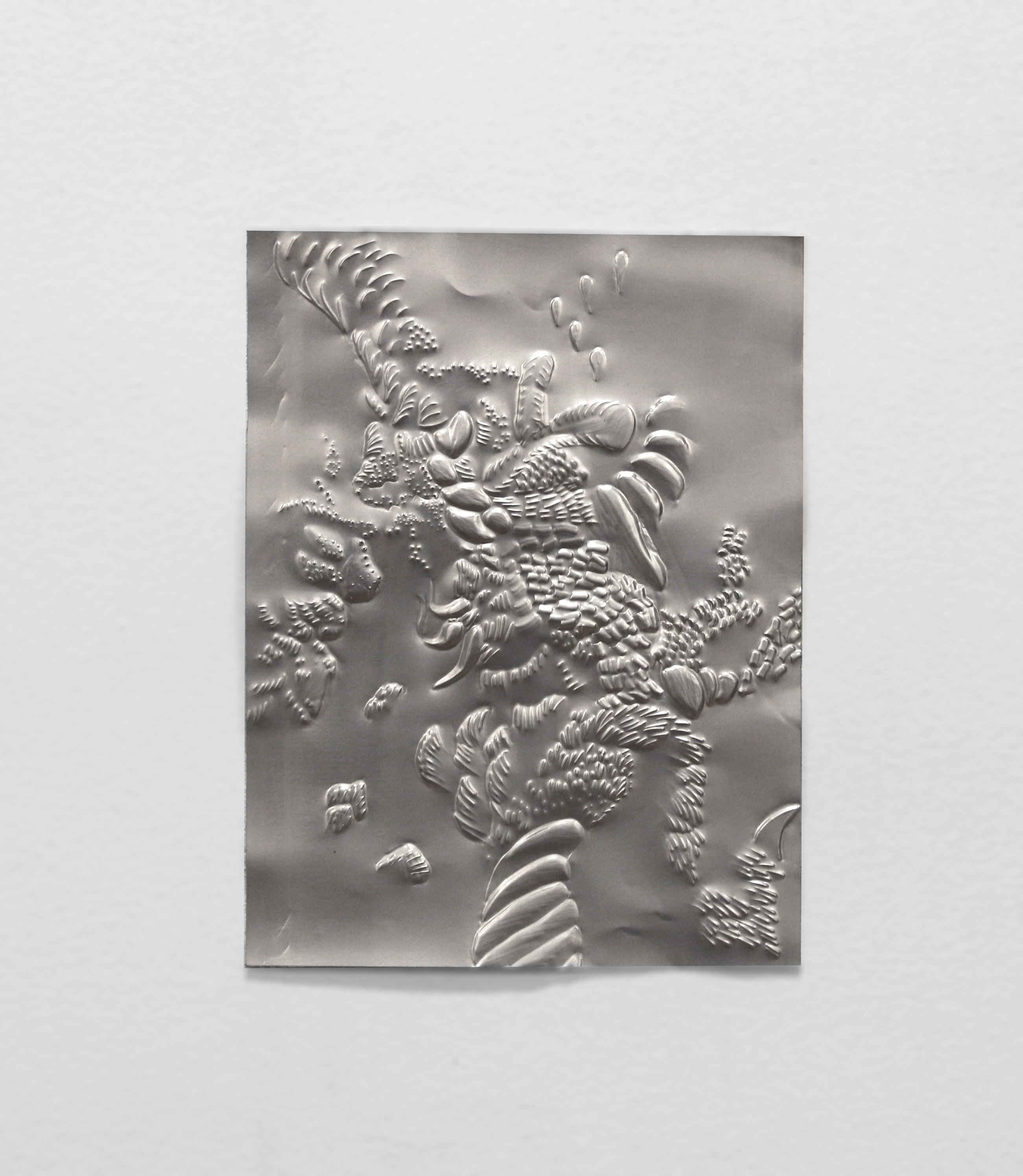 En los aluminios, las superficies brillantes del metal revelan el rastro de una naturaleza que pasó pero oculta una vibración interna, son placas que simulan una petrificación, pero al mismo tiempo están en movimiento: líneas, texturas y relieves brotan como si la materia recordara su origen orgánico. Las cerámicas continúan esta exploración de lo latente. Allí, los materiales terrosos cobran vida en formas que evocan fósiles distópicos. Son fragmentos de una naturaleza que aún no existe, o que quizás quedó suspendida en un tiempo indefinido, como evidencia de un mundo transformado por fuerzas invisibles.