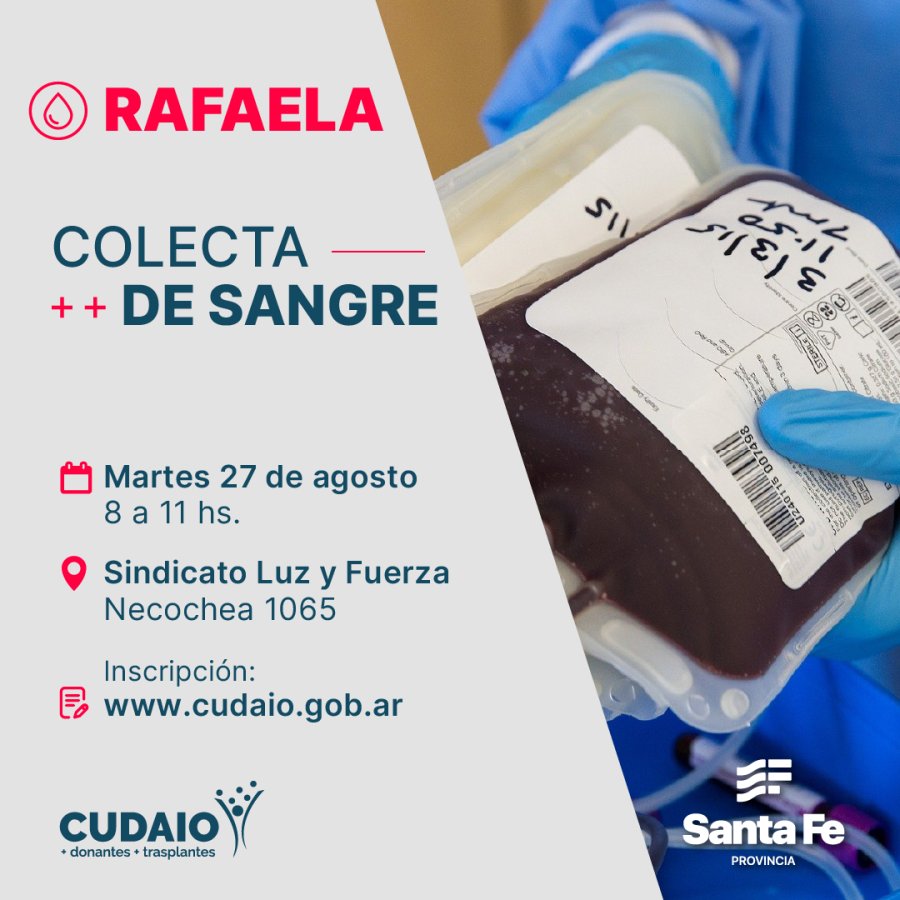 El Centro Único de Donación, Ablación e Implante de Órganos (CUDAIO) de la Provincia anunció una nueva colecta solidaria de sangre en Rafaela, que se llevará a cabo el próximo martes en el horario de 8:00 a 11:00 en el Sindicato de Luz y Fuerza de Rafaela, ubicado en calle Necochea 1065. La inscripción para participar en la colecta ya está abierta en la página oficial de CUDAIO en www.cudaio.gob.ar y también se reciben en las redes sociales del gremio o al teléfono 424727.