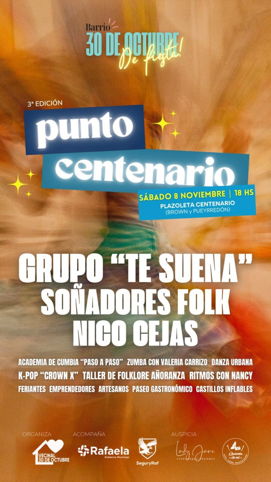 Hoy, sábado 8 de noviembre, el barrio 30 de Octubre se viste de fiesta para celebrar su aniversario con la tercera edición de “Punto Centenario”, un evento que reúne a vecinos, artistas y emprendedores locales en una jornada llena de color, música y comunidad. La cita será a partir de las 18:00 en la plazoleta Centenario, ubicada en Brown y Pueyrredón, con entrada libre y gratuita.