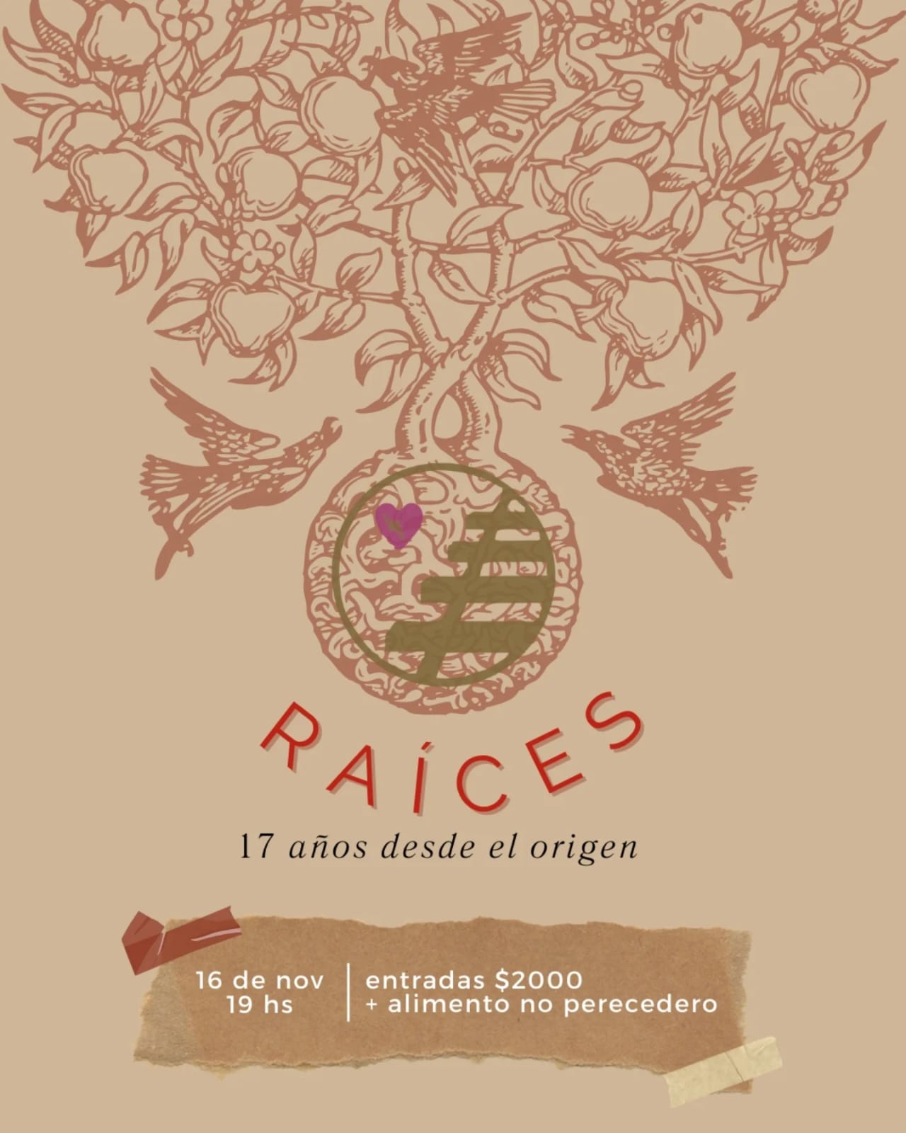 El próximo sábado 16 de noviembre a partir de las 19:00 se realizará una varieté de Raíces, para celebrar un aniversario más en su espacio, ubicado en Intendente Giménez 950.