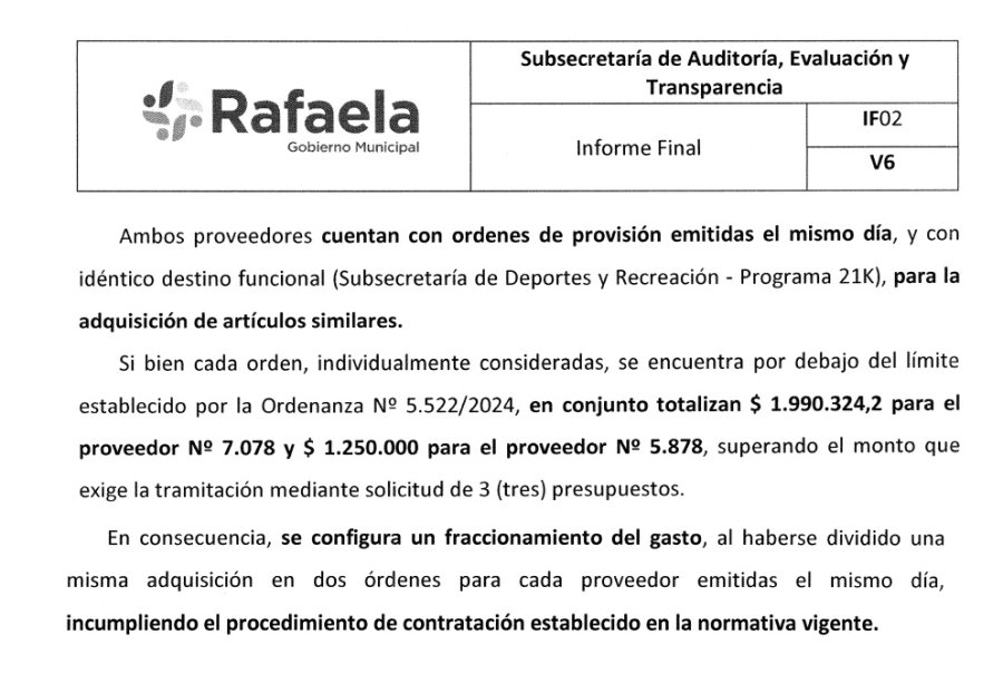 La documentación muestra dos órdenes de compra y puntualiza: “órdenes emitidas el mismo día y con idéntico destino funcional (Subsecretaría de Deportes) para la adquisición de productos similares. Se configura un fraccionamiento de gasto, al haberse dividido una misma adquisición, incumpliendo el procedimiento de contratación establecido en la normativa vigente”. Pero el auditor va más allá y sugiere “remitir las actuaciones detalladas a Fiscalía a fin de que evalúe la situación relevada y, en caso de corresponder, adopte las medidas que estime pertinentes” (Página 33).