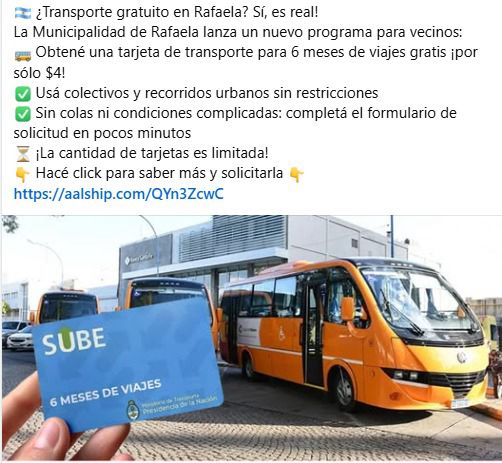 La Municipalidad de Rafaela informa a toda la comunidad que es absolutamente falsa la publicación que circula en redes sociales sobre un supuesto programa que ofrece una tarjeta SUBE con “6 meses de viajes gratis por $4”.