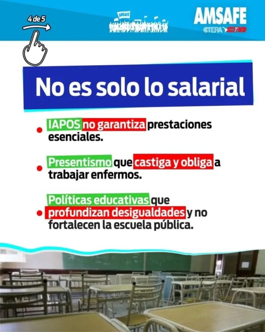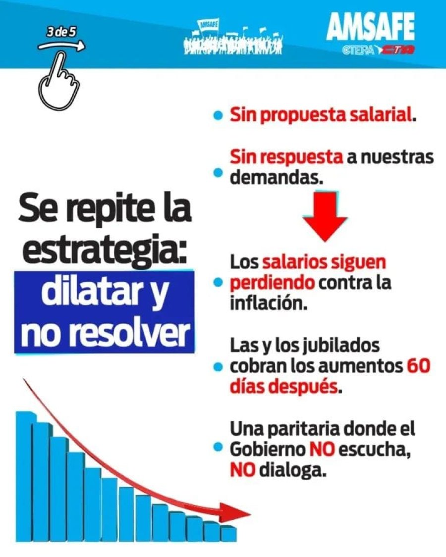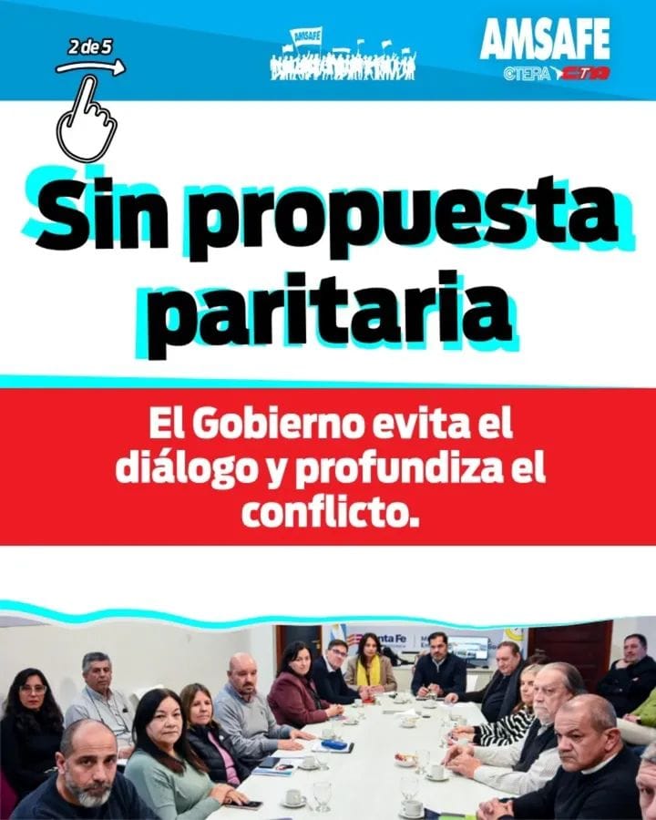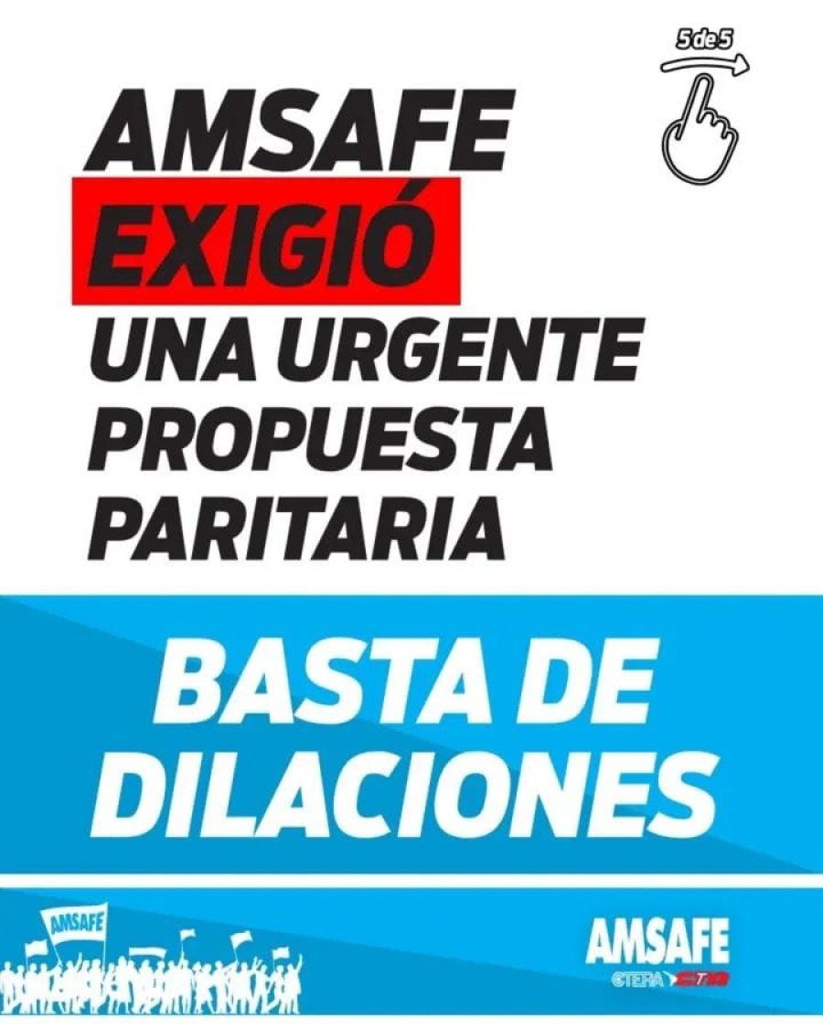 Ante la ausencia de propuestas, AMSAFE decidió retirarse del ámbito paritario a los 15 minutos de iniciado el encuentro e intimar formalmente al gobierno provincial a presentar de forma urgente una propuesta que atienda las necesidades de las y los trabajadores de la educación.