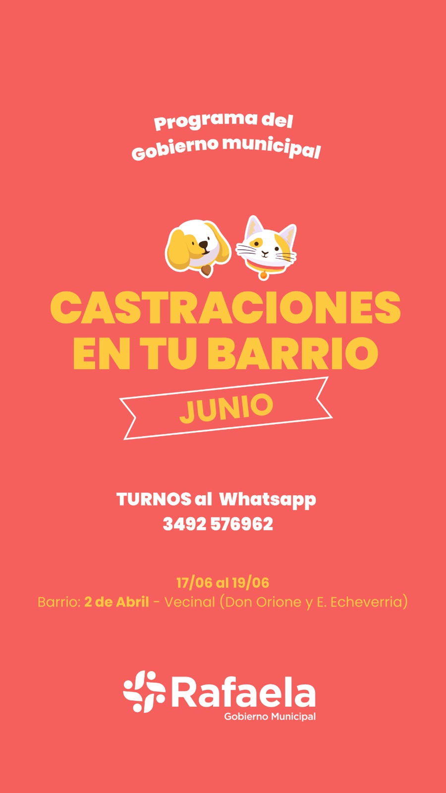 La Dirección de Zoonosis de la Municipalidad informa que el programa de “Castraciones en tu barrio” estará del 17 al 19 de junio en la vecinal del barrio 2 de Abril, en calle Don Orione y E. Echeverría.