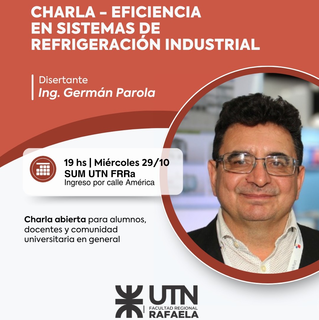 La Universidad Tecnológica Nacional Facultad Regional Rafaela (UTN FRRa) llevará a cabo el próximo miércoles 29 de octubre, a las 19:00, una charla sobre “Eficiencia en sistemas de refrigeración industrial”, que estará a cargo del ingeniero Germán Parola. La actividad se desarrollará en el Salón de Usos Múltiples (SUM) de la casa de estudios, con ingreso por calle América.