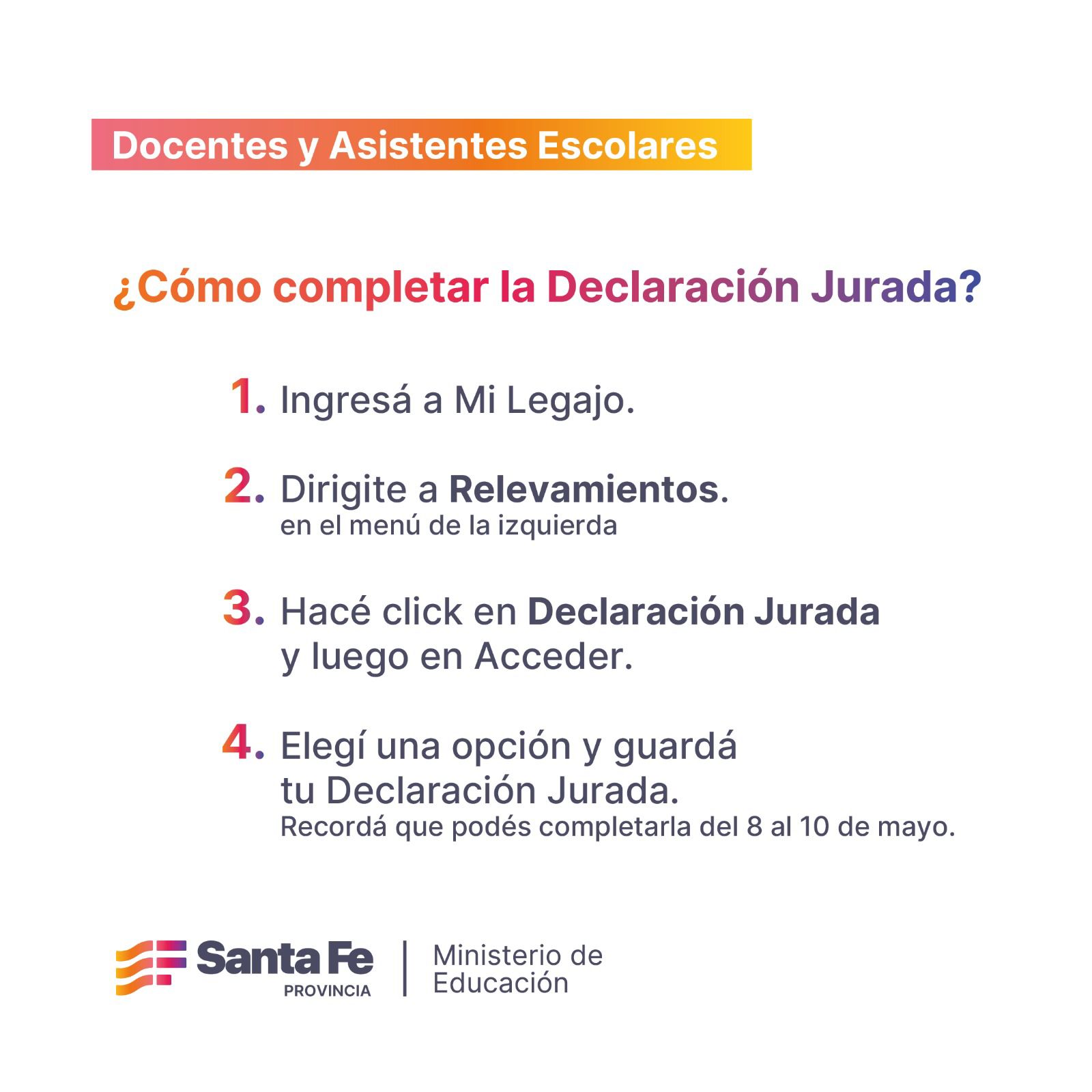 Los docentes y asistentes escolares que no adhieran a la medida de fuerza convocada por los gremios provinciales podrán completar la Declaración Jurada de Prestación de Servicios en el sitio del gobierno provincial “Mi Legajo” (https://www.santafe.gob.ar/milegajo).