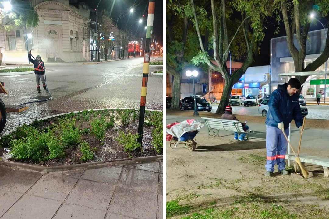 Especial atención se está poniendo en el centro de la ciudad, donde se concentró la mayor parte de los vecinos. Allí, se realizan labores de limpieza en la Plaza 25 de Mayo, se recolectan los residuos, se vacían los cestos de basura y se riegan los espacios verdes.