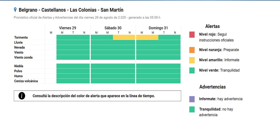 El centro del país, y fundamentalmente en gran parte de la provincia de Santa Fe, y tal como lo había adelantado este medio en su sitio web el pasado miércoles, continúa en alerta amarillo por tormentas fuertes para este último fin de semana del mes de agosto, emitido durante la tarde de este viernes por el Servicio Meteorológico Nacional (SMN). El aviso rige desde la mañana de este sábado 30 y se extenderá durante todo el domingo 31 de agosto, con condiciones de mal tiempo que afectarán gran parte del territorio santafesino.
