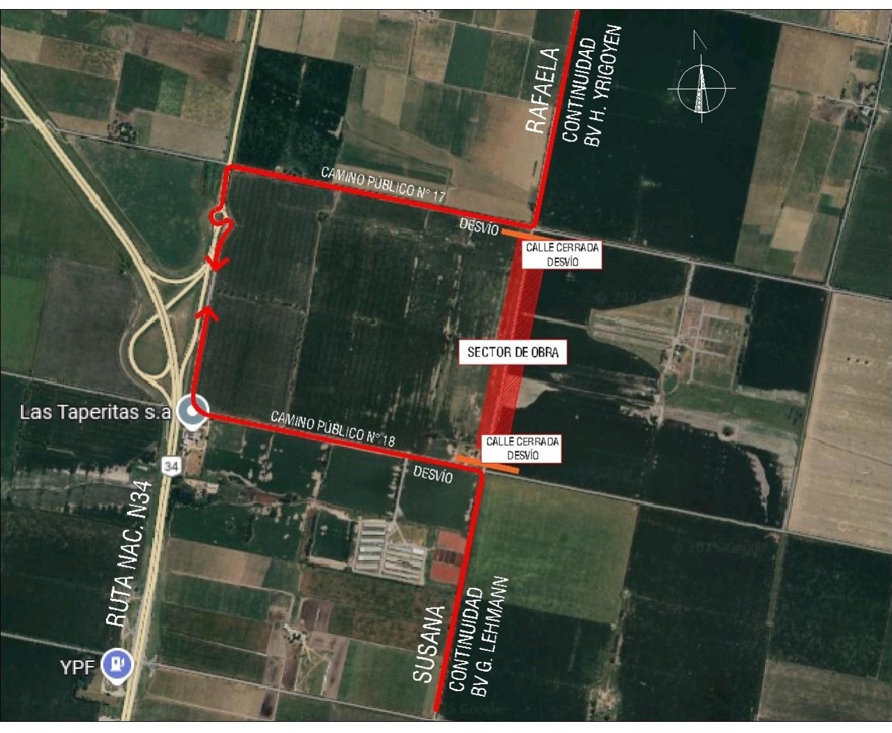 Asimismo, quienes circulen en sentido norte-sur por la prolongación de bulevar Hipólito Yrigoyen deberán tomar el Camino nro. 17 hasta la Ruta Nacional Nro. 34. En tanto que quienes lo hagan en sentido sur-norte por la misma prolongación deberán girar hacia el oeste por el Camino Nro.18 hasta Ruta Nacional Nro. 34.