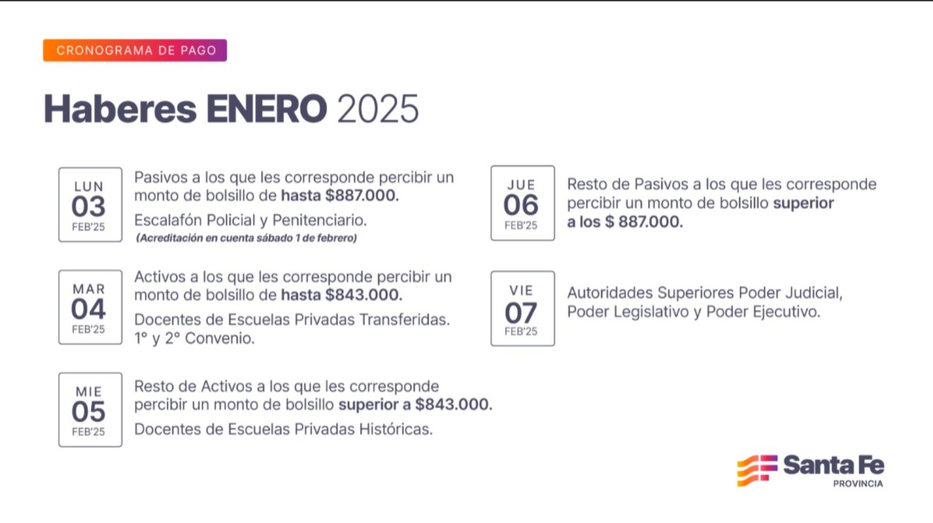 El Gobierno de la Provincia de Santa Fe, a través del Ministerio de Economía, informa que los trabajadores públicos percibirán sus salarios desde el lunes 3 de febrero hasta el viernes 7.