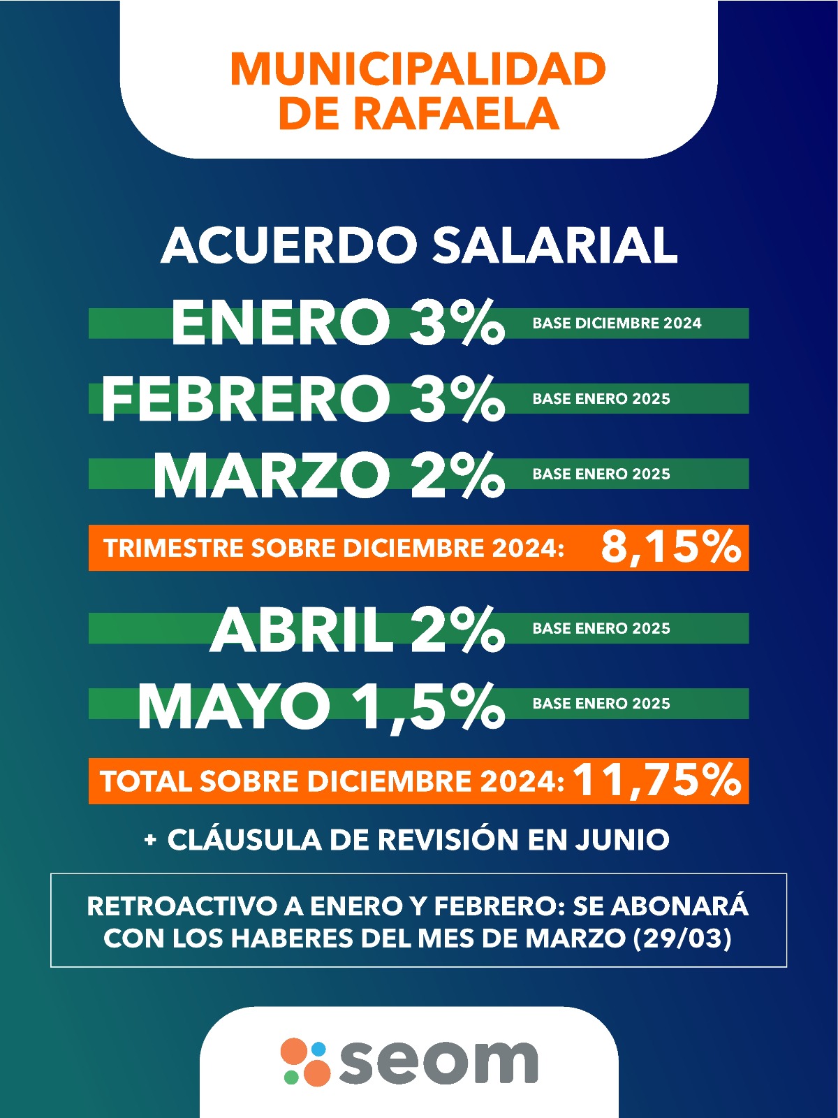 La Municipalidad de Rafaela y el Sindicato de Empleados y Obreros Municipales (SEOM) anunciaron un acuerdo salarial para los primeros cinco meses de 2025, tras diversas reuniones que se llevaron a cabo entre la semana pasada y el lunes último. El aumento acumulado entre enero y mayo de este año alcanzará el 11,75 por ciento, según informó el gremio que preside Darío Cocco.