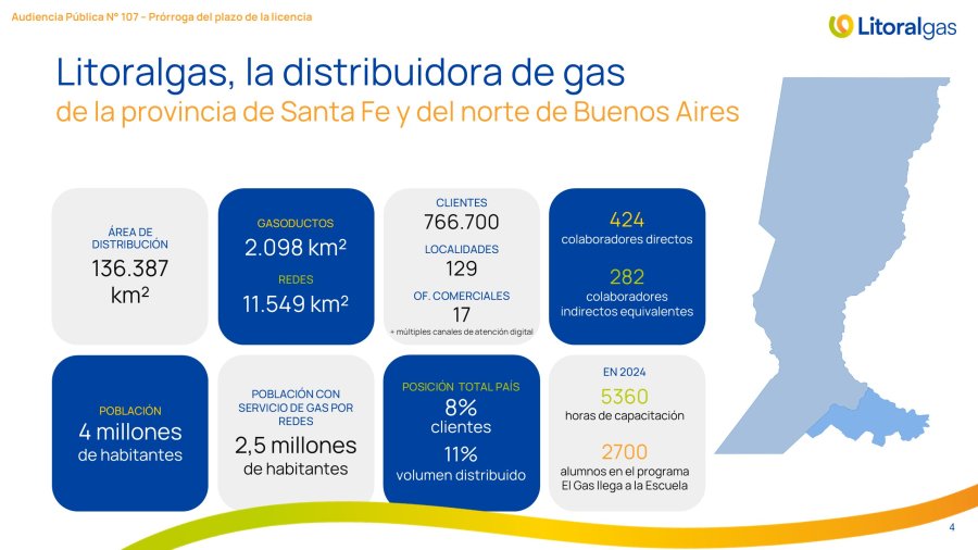 Litoralgas participó ayer de la Audiencia Pública convocada por el Ente Nacional Regulador del Gas (ENARGAS), con el objetivo de presentar formalmente su solicitud de prórroga del contrato de licencia para la prestación del servicio público de distribución de gas por redes, conforme a lo establecido en la Ley 24.076 y en las Reglas Básicas de la Licencia de Distribución.