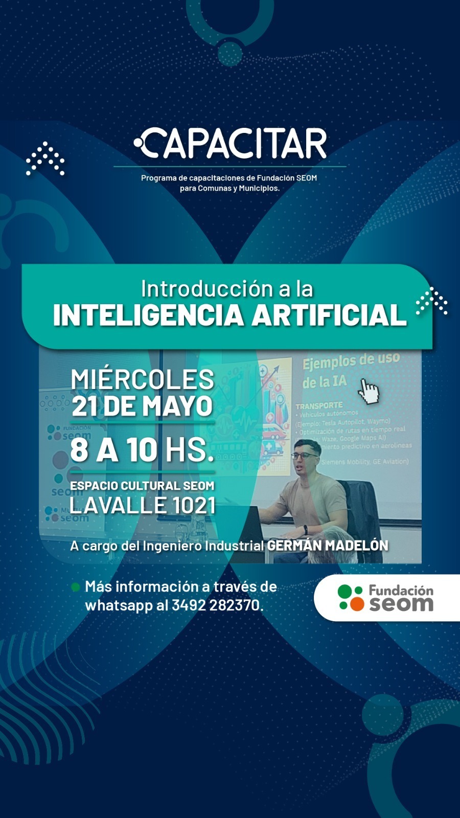 En el marco del programa CAPACITAR, Fundación SEOM invita a participar del Curso “Introducción a la Inteligencia Artificial”, un espacio pensado para conocer las aplicaciones reales de esta tecnología que ya está transformando distintos aspectos de nuestra vida cotidiana.