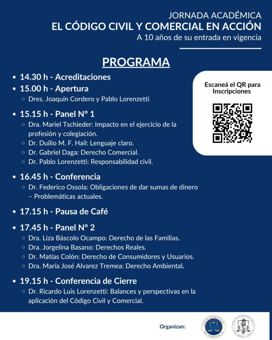 Participarán destacados expositores, entre los cuales se encuentran los Dres. Ricardo Luis Lorenzetti (ministro de la Corte Suprema de Justicia de la Nación), Federico Ossola (juez de la Cámara de Apelaciones en lo Civil y Comercial de Córdoba), Pablo Lorenzetti, María José Alvarez Tremea y Duilio Hail (jueces de la Cámara de Apelaciones en lo Civil, Comercial y Laboral de Rafaela) y Mariel Tschieder (presidenta de la Federación Argentina de Colegios de la Abogacía).