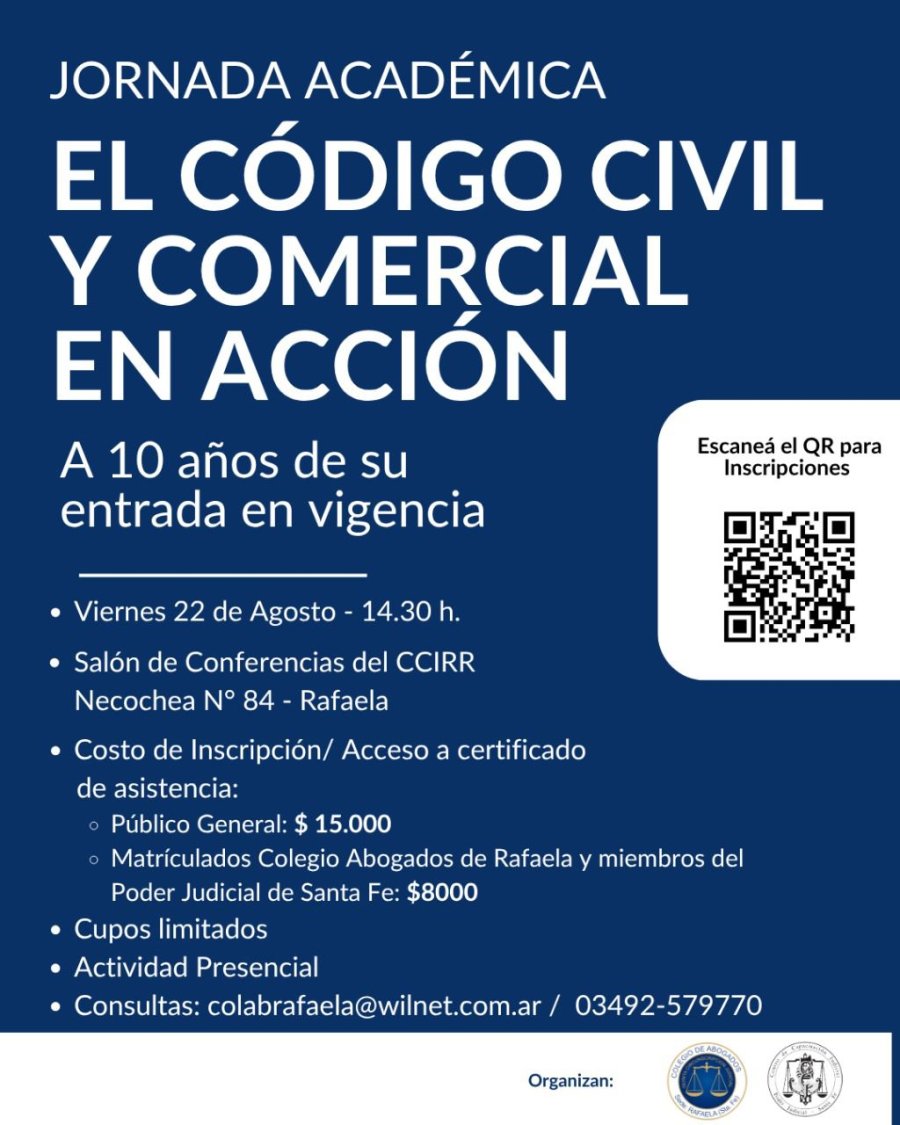 Al conmemorarse los primeros diez años de vigencia de la implementación del Código Civil y Comercial de la Nación, el viernes 22 de agosto se realizará en Rafaela una jornada académica dedicada a debatir aspectos y materias vinculados con su aplicación práctica.