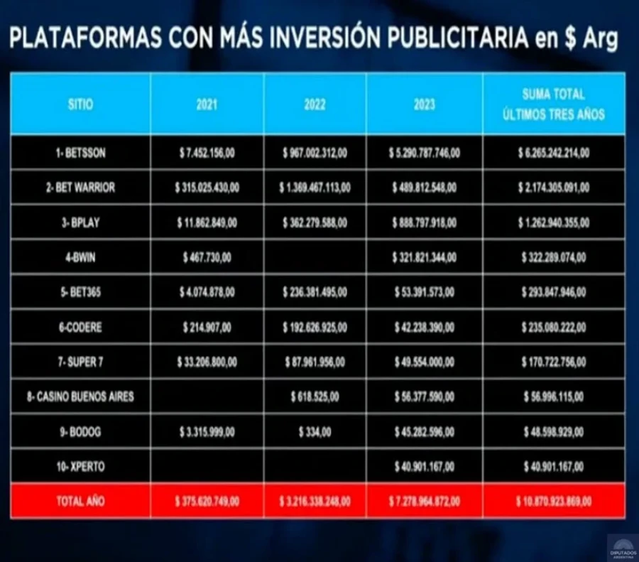 Más. Las 10 plataformas que más publicitan el juego de azar en línea en Argentina en 2023 anunciaron por $7.278.964.872, más del doble que el año anterior. Figura en un cuadro presentado en el plenario de las Comisiones de Adicciones y Control de Narcotráfico, Acción Social y Salud Pública, Comunicaciones e Informática y Legislación Penal, donde no se incluye publicidad en Google, ni Redes Sociales.