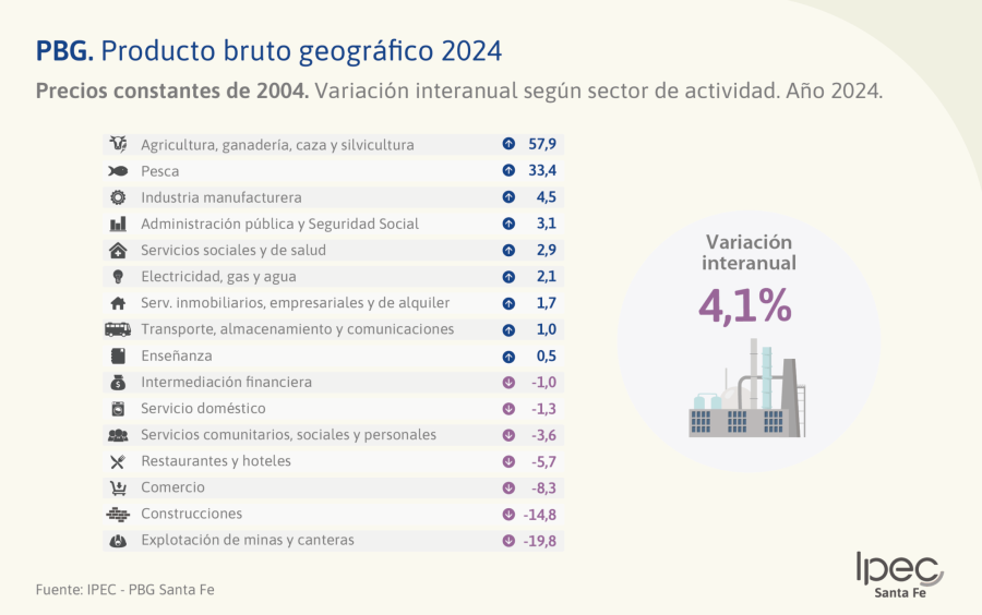 La economía de la provincia de Santa Fe cerró el año 2024 con un crecimiento real del 4,1%, según la estimación provisoria del Producto Bruto Geográfico (PBG) publicada por el Instituto Provincial de Estadística y Censos (IPEC). El avance se dio en un contexto de marcada recuperación del sector productor de bienes, que compensó la caída registrada en los servicios.