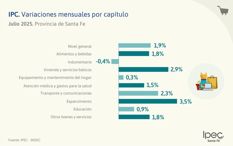El Instituto Provincial de Estadística y Censos (IPEC) informó que el Índice de Precios al Consumidor (IPC) en la provincia de Santa Fe registró en julio de 2025 un incremento del 1,9%, lo que llevó la variación acumulada en los primeros siete meses del año al 18,6%. En la comparación interanual, la suba alcanzó el 36,6%.