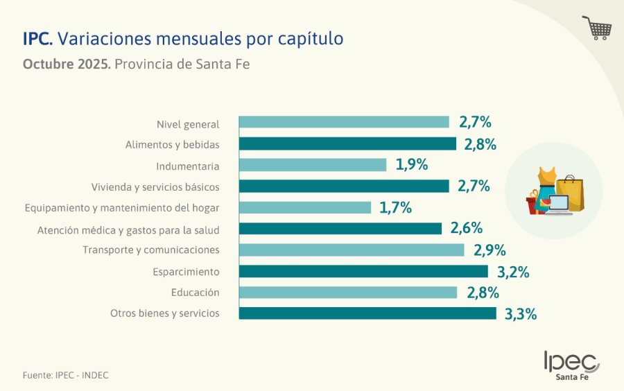 El Instituto Provincial de Estadísticas y Censos (IPEC) difundió el Índice de Precios al Consumidor (IPC) correspondiente a octubre de 2025 en la provincia de Santa Fe. Según el organismo, el nivel general registró una variación mensual del 2,7%, en tanto que la inflación interanual alcanzó el 32,5%. Con este resultado, la variación acumulada en los primeros diez meses del año se ubicó en 26,7%.