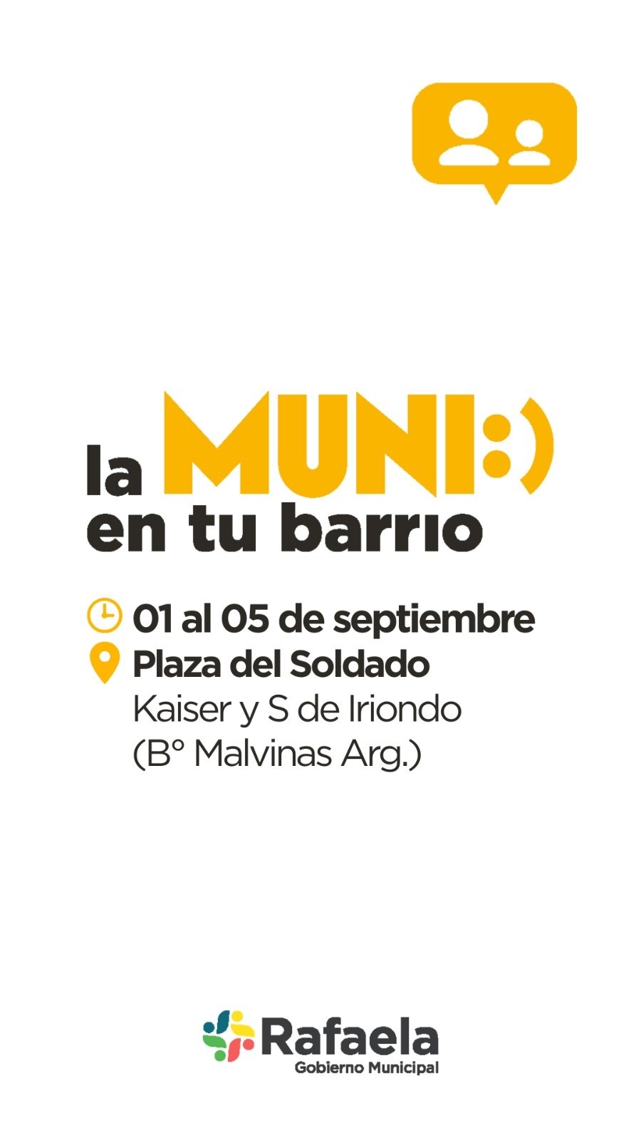 Desde este lunes 1º de septiembre, el Gobierno Municipal de Rafaela se instalará con su dispositivo «La Muni en tu barrio» en el barrio Malvinas Argentinas, en la Plaza del Soldado ubicada en Kaiser y S. de Iriondo.