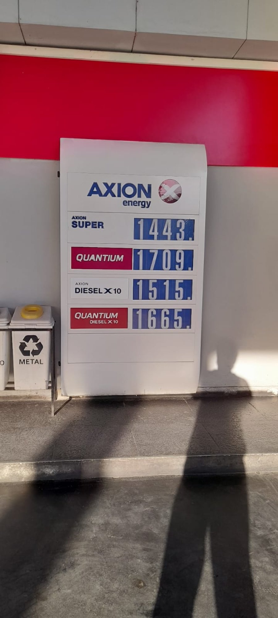 * Axión: Nafta Súper: $ 1.443. Quatium: $ 1.709. Diesel X10: $ 1.515. Quatium Diesel: $ 1.665. (por ahora no registra nuevos incrementos).