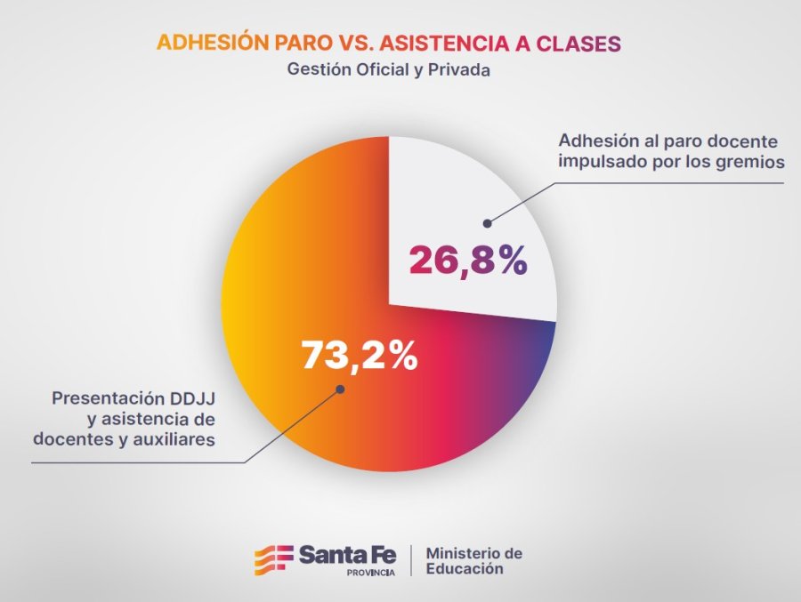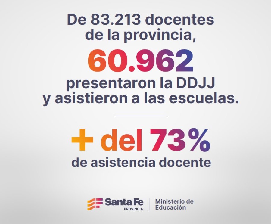 Figueroa afirmó que “60.962 docentes de toda la provincia estuvieron en su lugar de trabajo y completaron la declaración jurada que da cuenta que prestaron servicio”. De un universo total de 83.213 representa el 73,2% de no adhesión a la medida de fuerza, y un 26,8% de adhesión. “Hoy, una vez más, estamos rindiendo cuentas del nivel de información y transparencia. Consideramos que esta herramienta es muy valiosa porque permite en las mismas condiciones ejercer el derecho a trabajar como el derecho a huelga”, señaló la funcionaria, y añadió que el paro como medida de fuerza “aparece como un instrumento agotado”.