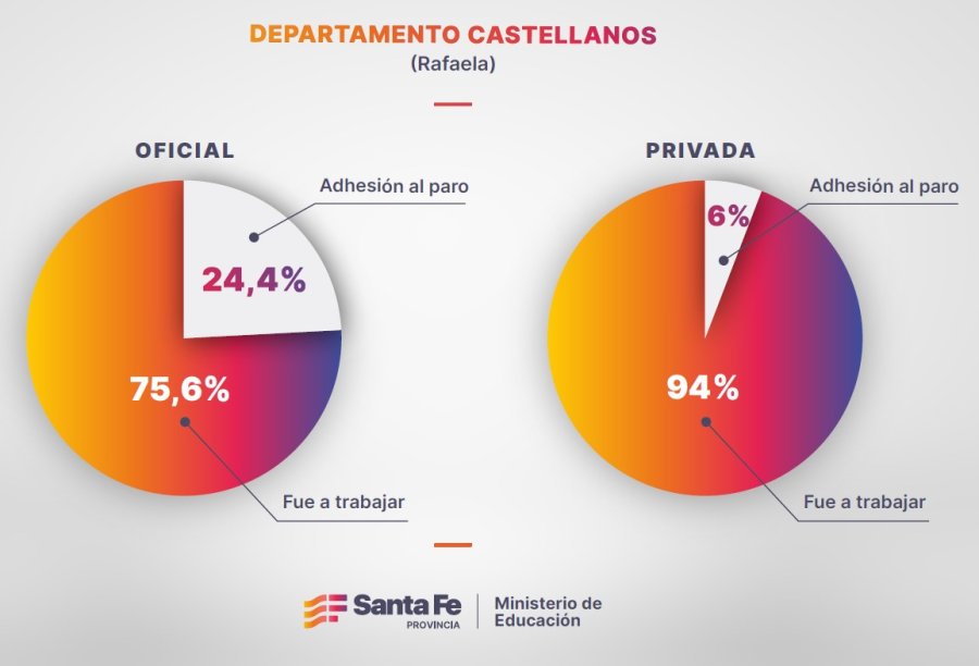 Por su parte las escuelas de gestión privada presentaron el siguiente nivel de adhesión: “El departamento Castellanos presentó un nivel de adhesión al paro del 6% y el 94% de los docentes prestaron servicios. En el departamento General López 17,3 % adhirieron, mientras que fueron a trabajar 82,7 %; en el departamento General Obligado un 15,3 % paró y 84,7 % trabajó; en La Capital el porcentaje de adhesión fue del 18,2 % y estuvieron en las escuelas el 81,8 %, y en el departamento Rosario, un 31,2 % adhirió y un 68,8% no lo hizo”, concluyó.