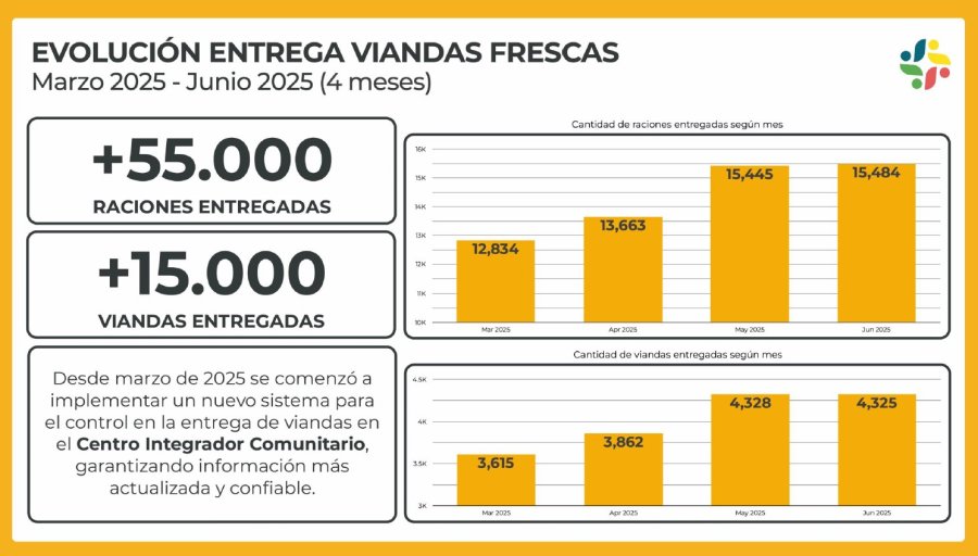 Precisamente, en un lapso de cuatro meses que va de marzo a junio, aumentó un 20 por ciento tanto las viandas como las raciones que se entregan a los beneficiarios. En marzo se repartieron 12.834 raciones y en junio la cifra aumentó a 15.484. En cuanto a las viandas, en marzo se distribuyeron 3.615 y en junio 4.325.