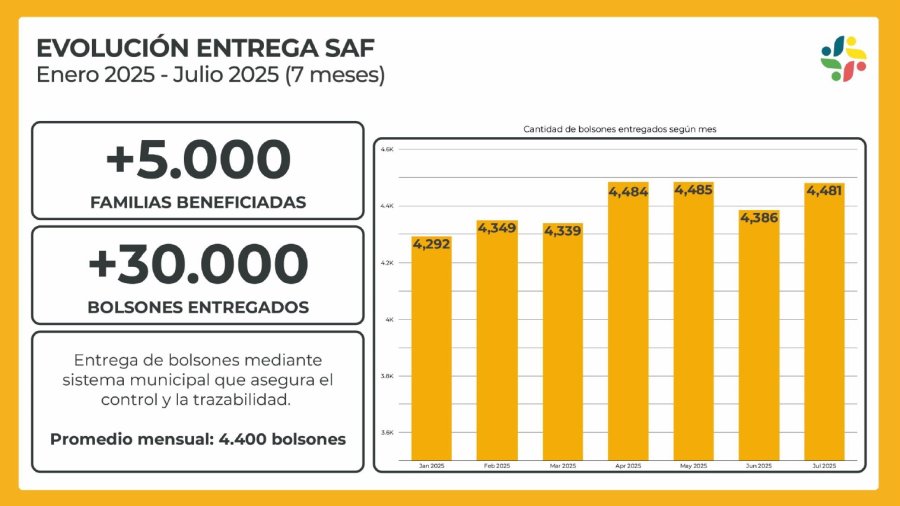 De acuerdo con los datos presentados, el refuerzo alimentario que se entrega en la oficina de Santos Vega alcanzó a unas 5.000 familias entre enero y julio, con más de 30.000 bolsones distribuidos en ese período, con un promedio de 4.400 por mes. Este esquema está destinado a personas que enfrentan situaciones inesperadas, como pérdida de empleo o problemas de salud, y su padrón se actualiza mensualmente.