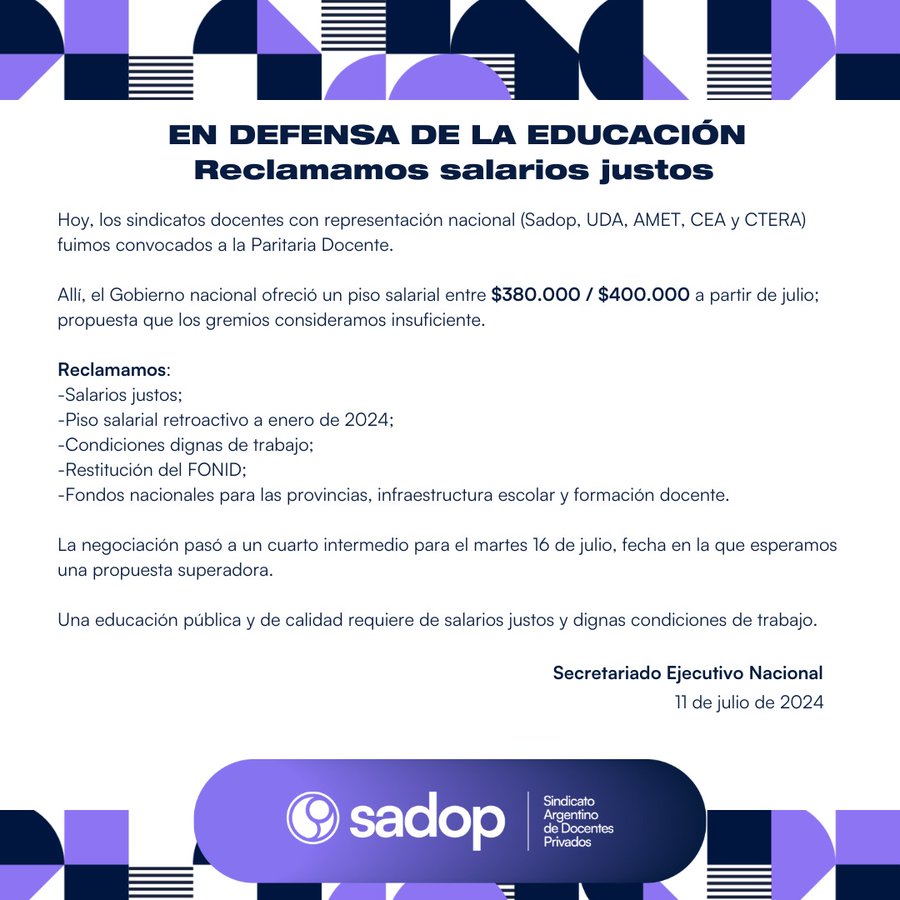 Los gremios docentes nucleados en la Confederación General del Trabajo (CGT) anticiparon la realización de un paro nacional si el gobierno nacional no realiza “un ofrecimiento salarial aceptable”. Representantes del Sadop, UDA, CEA y Amet advirtieron mediante un comunicado "la profundización del conflicto" y anticiparon "la realización de un paro nacional si el gobierno no realiza una oferta salarial atendible".