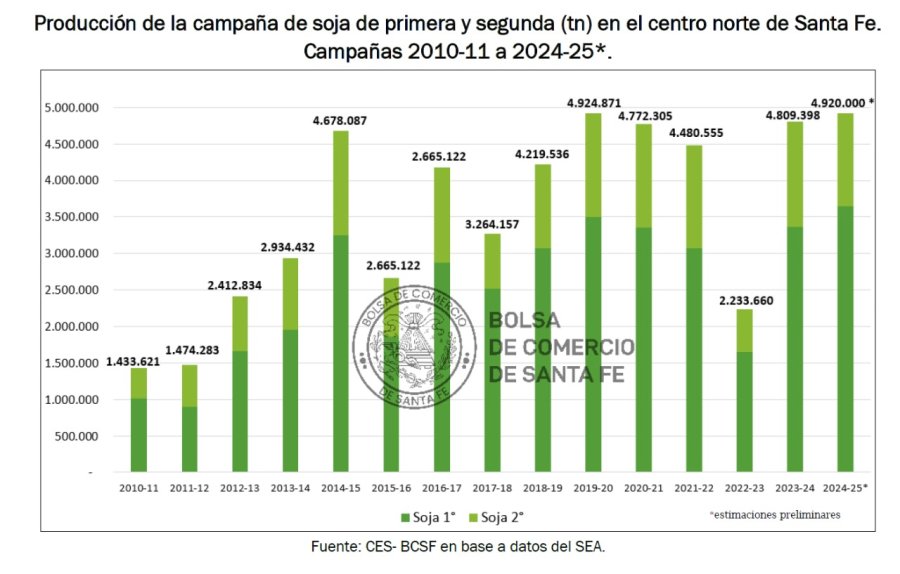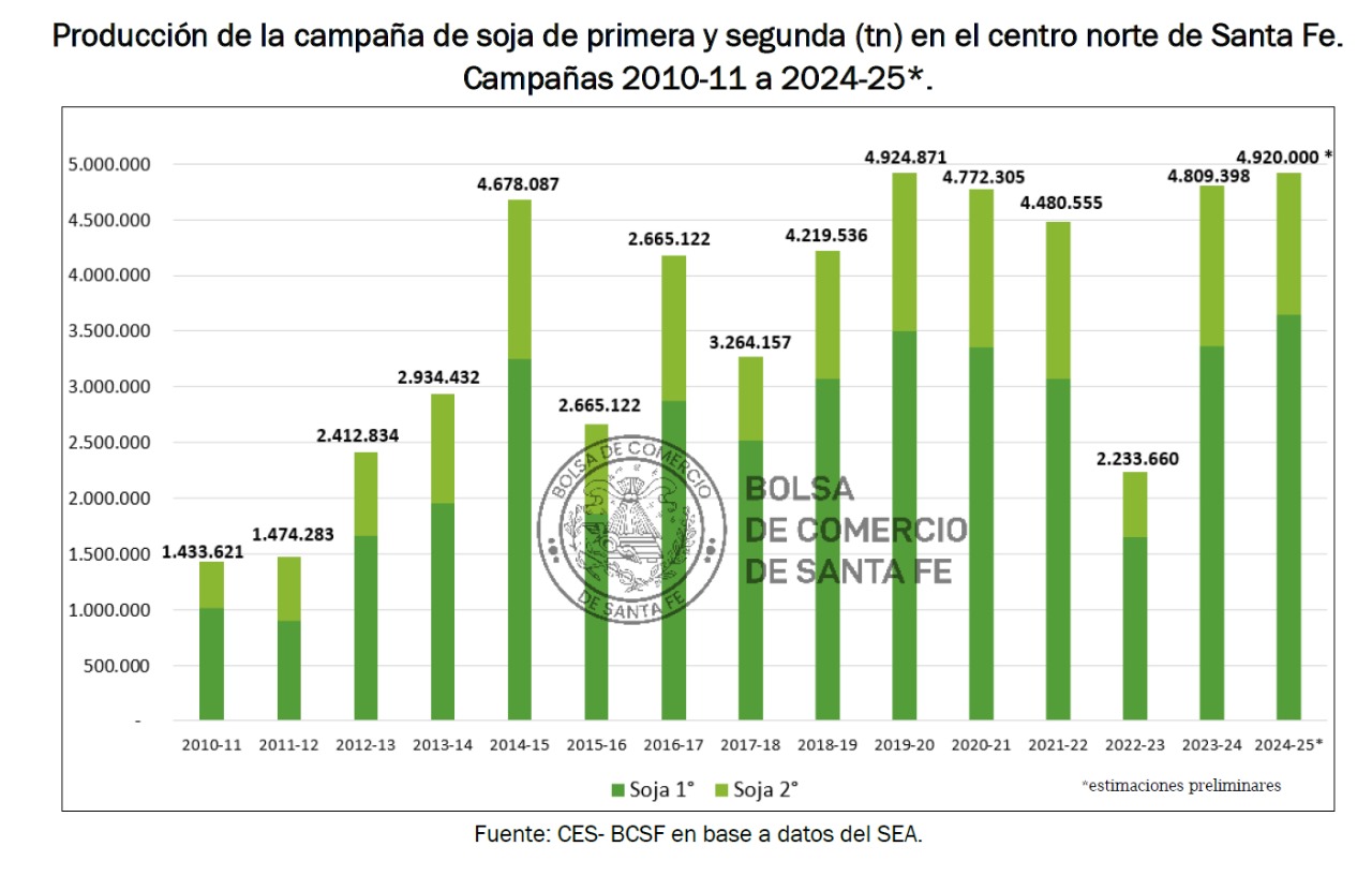 En el área comprendida por el Sistema de Estimaciones Agrícolas (SEA), que incluye 12 departamentos entre los que se encuentran Castellanos, la superficie sembrada de soja de primera se ubicó en 1.037.000 ha., mientras que, para el caso de la soja tardía se estiman unas 600.000 ha.