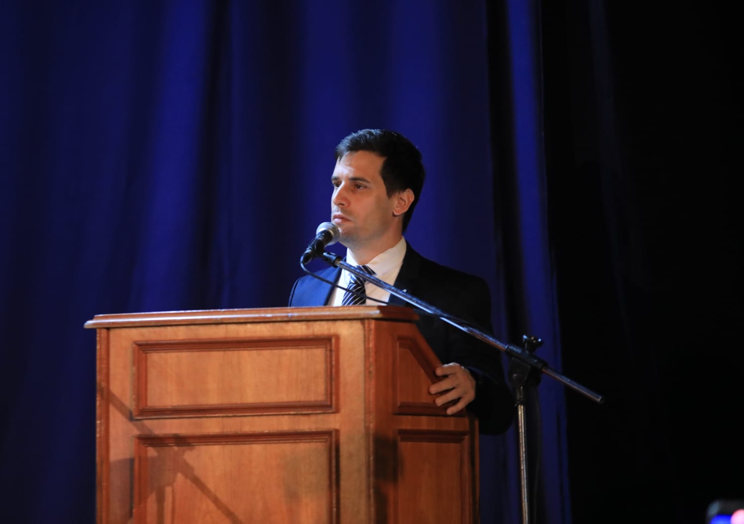 DISCURSO. El intendente Leonardo Viotti dejó su mensaje alusivo a la fecha en el acto que se desarrolló en el Cine Belgrano. Crédito: FOTO PRENSA MUNICIPAL