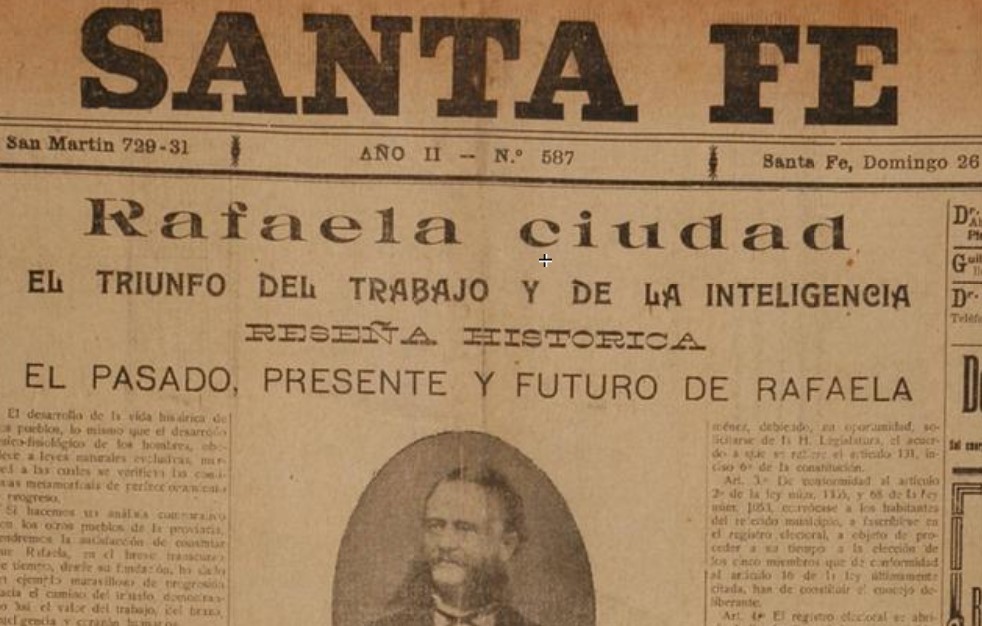 "Rafaela Ciudad. El triunfo del trabajo y la inteligencia" titula el diario Santa Fe en su edición del 26 de enero de 1913, tal como se puede observar en los archivos de la Hemeroteca de la Provincia. "Si hacemos un análisis comparativo con los otros pueblos de la provincia tendremos la satisfacción de constatar que Rafaela, en el breve transcurso de tiempo desde su fundación, ha dado un ejemplo maravilloso de progresión hacia el camino del triunfo demostrando así el valor del trabajo, del brazo, inteligencia y corazón humanos", afirma el artículo.