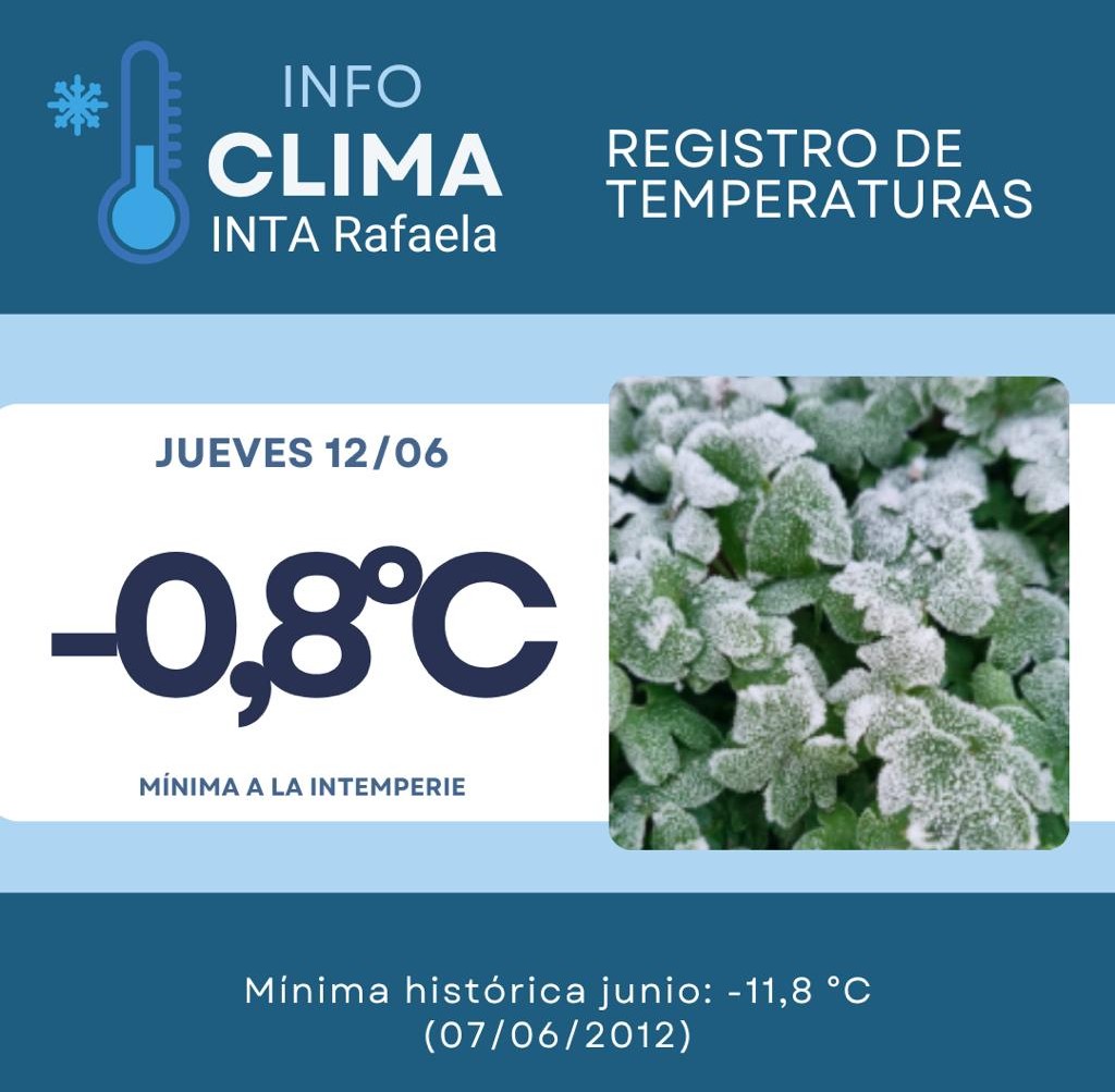 Según el registro de temperaturas que viene llevando a cabo la Estación Experimental Agropecuaria del INTA Rafaela, este miércoles se registraron temperaturas bajo 0 en nuestra ciudad. De hecho, el termómetro registró -4,8ºC a la intemperie, recordando que hasta el momento, la mínima histórica de junio se dio el 07//06/2012 con -11,8ºC. También este jueves a la intemperie, la mínima fue de -0,8ºC. Y en cuanto al registro de lluvias, según el INTA, el pasado sábado por la mañana se dieron algunas precipitaciones en la ciudad que se extendieron hasta el mediodía, siendo 0,8 milímetros la lluvia acumulada en la jornada, donde en la previa, la temperatura a la intemperie había sido de -3,6ºC. Hasta el día de hoy, la lluvia acumulada en lo que va de junio es de 1 mm, siendo la histórica media mensual de 26 milímetros.