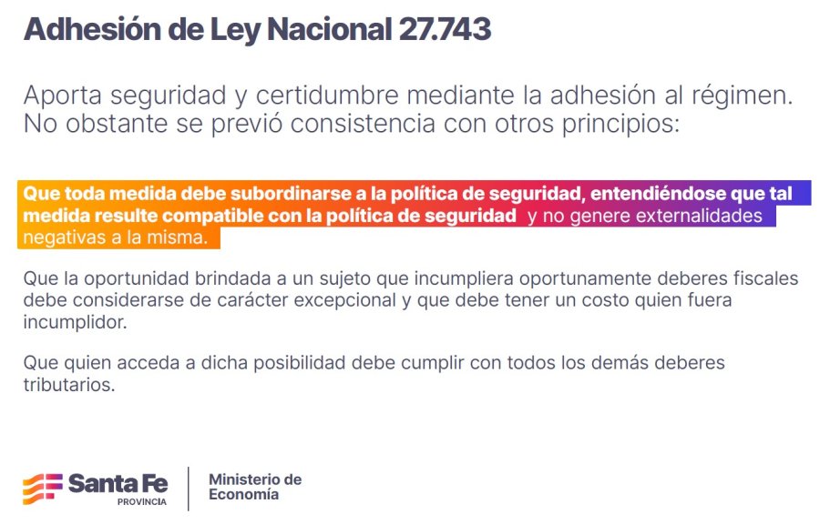 Desde el Gobierno provincial destacaron también que se exigirá la condición que, tanto el sujeto que adhiera al régimen como el grupo económico al que pudiese pertenecer, se encuentren al día con todos los deberes tributarios con el Estado Provincial.