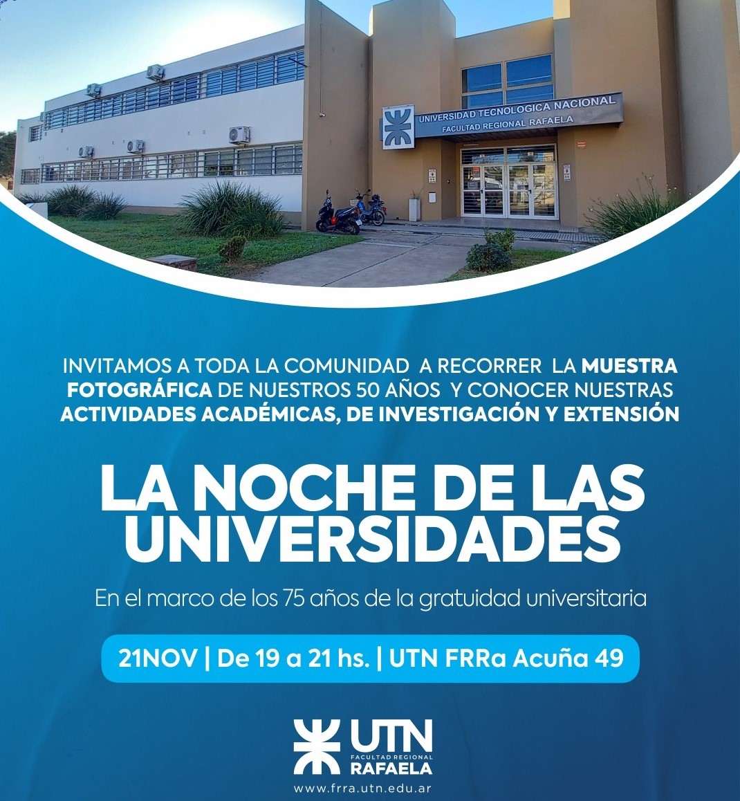 La Universidad Tecnológica Nacional Facultad Regional Rafaela (UTN FRRa) efectuó una invitación abierta a toda la comunidad para participar de "La Noche de las Universidades", una actividad que se llevará a cabo en el marco del 75° aniversario de la gratuidad universitaria en Argentina. El evento será el jueves 21 de noviembre, desde las 19 y hasta las 21 horas, en su edificio ubicado en Acuña 49, en barrio Villa Rosas.