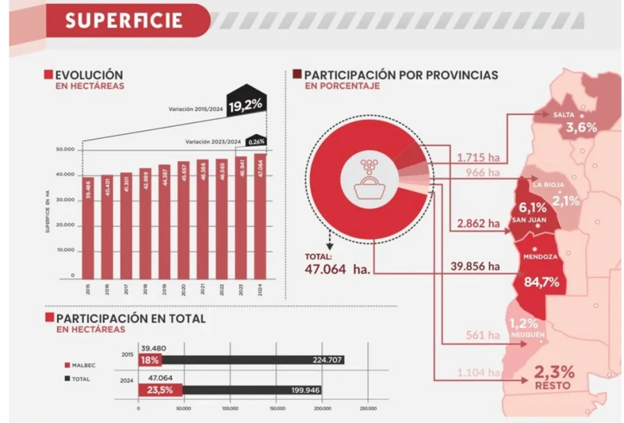 En diez años, la superficie cultivada con Malbec pasó de 39.480 hectáreas en 2015 a 47.064, un crecimiento del 19,2%.