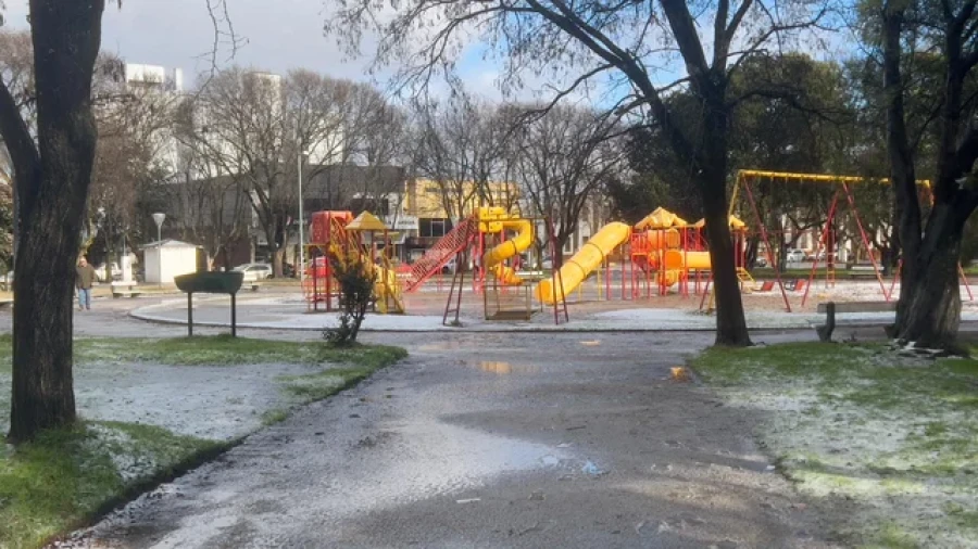 La playa de Miramar se tiñó de blanco ante la intensa nevada de las últimas horas, la que dejó una hermosa postal para los turistas y vecinos de la ciudad balnearia.