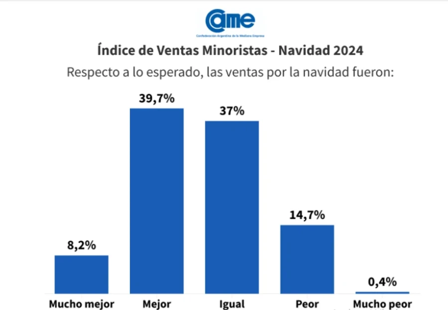 Las ventas navideñas en los comercios minoristas pymes registraron un aumento del 1% en 2024, en comparación con el mismo período del año anterior, según un relevamiento difundido por la Confederación Argentina de la Mediana Empresa (CAME).