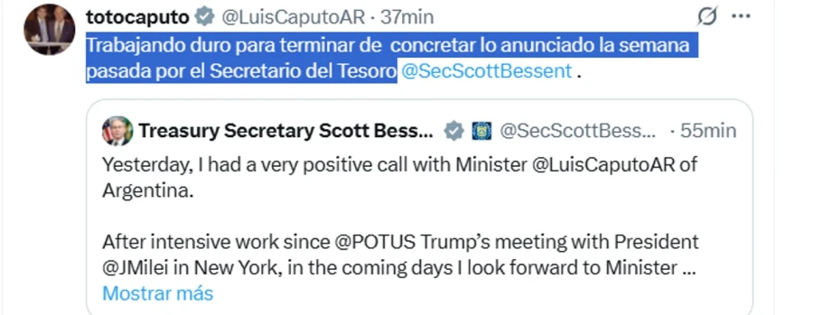 “Después de un intenso trabajo desde la reunión del presidente Donald Trump con el Presidente Javier Milei en Nueva York, en los próximos días espero que el equipo del Ministro Caputo venga a DC para avanzar significativamente en nuestras discusiones en persona sobre las opciones para brindar apoyo financiero”, indicó Bessent en una comunicación a través de redes sociales.