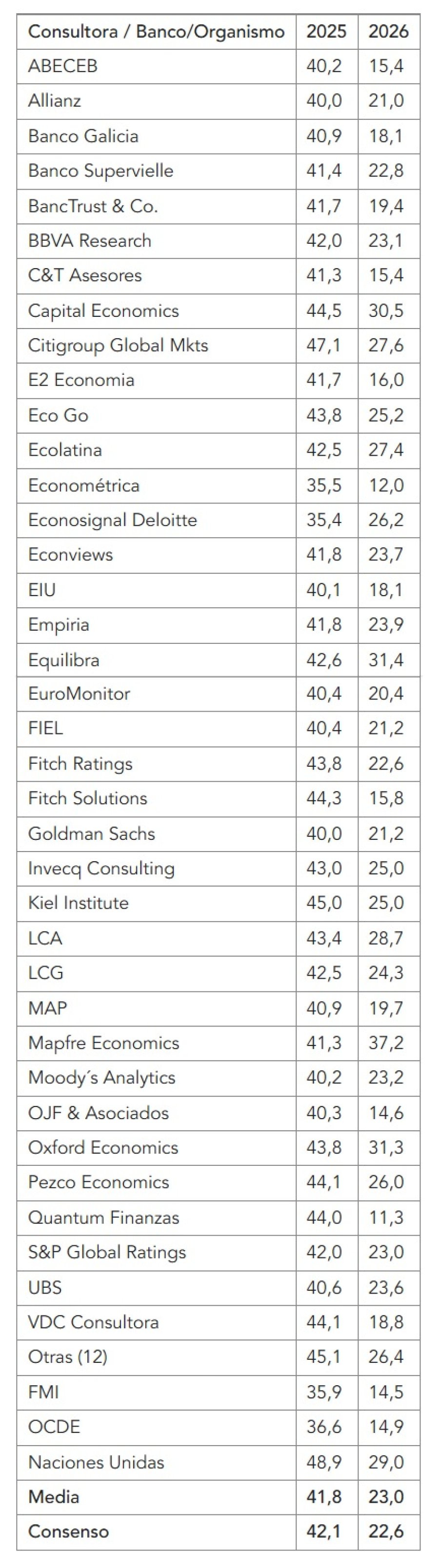 Para el último trimestre del año, en el que se harán las elecciones legislativas nacionales (26 de octubre), la media estima 2,6% de inflación ese mes, 2,4% para noviembre y 2,7% para diciembre.