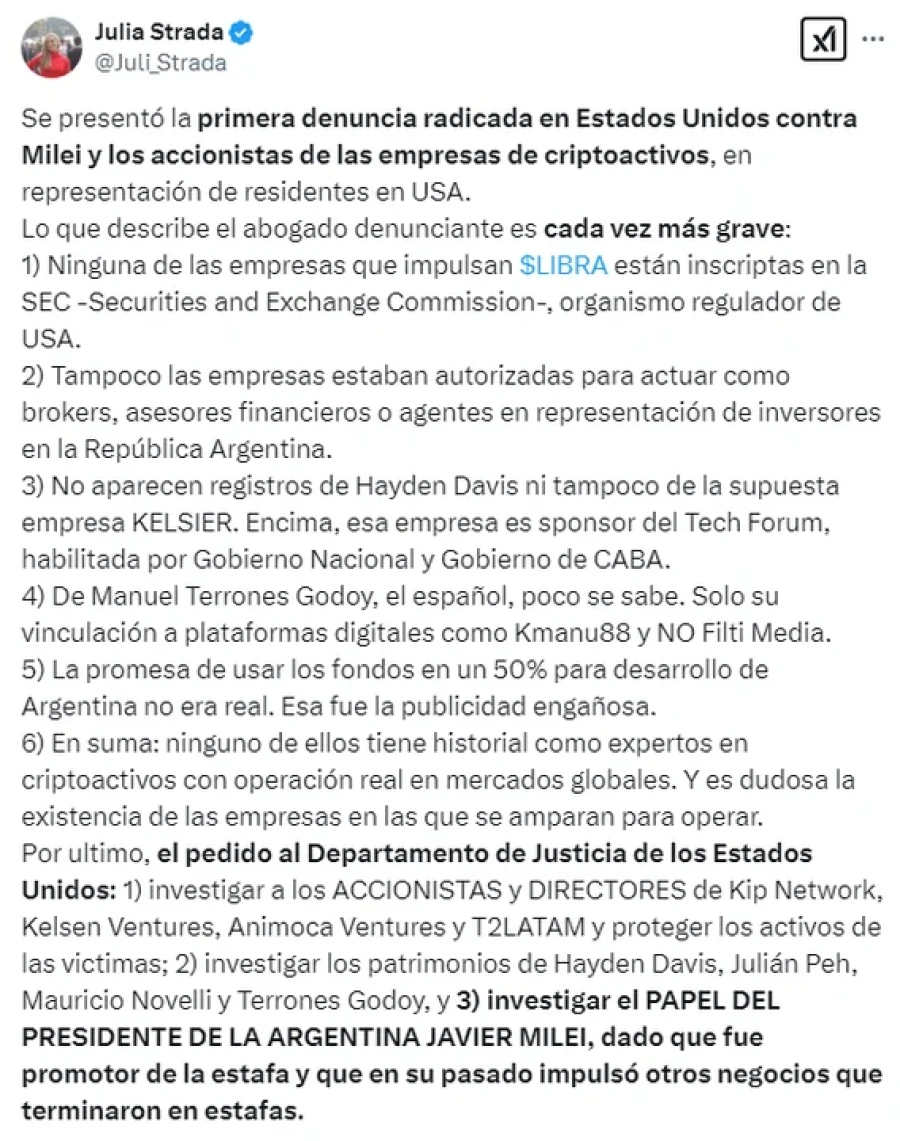 La diputada de Unión por la Patria, Julia Strada, comentó sobre la denuncia a través de sus redes sociales, señalando que "se presentó la primera denuncia radicada en Estados Unidos contra Milei y los accionistas de las empresas de criptoactivos, en representación de residentes en USA. Lo que describe el abogado denunciante es cada vez más grave".
