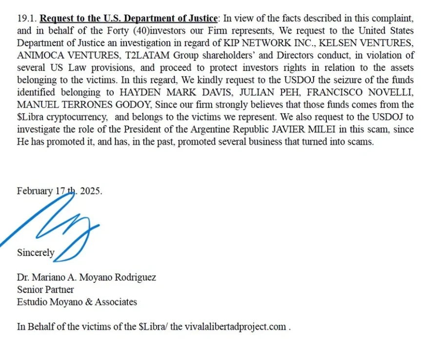 Además, se solicita investigar a los accionistas y directores de Kip Network, Kelsen Ventures, Animoca Ventures y T2LATAM, así como proteger los activos de las víctimas de esta situación.