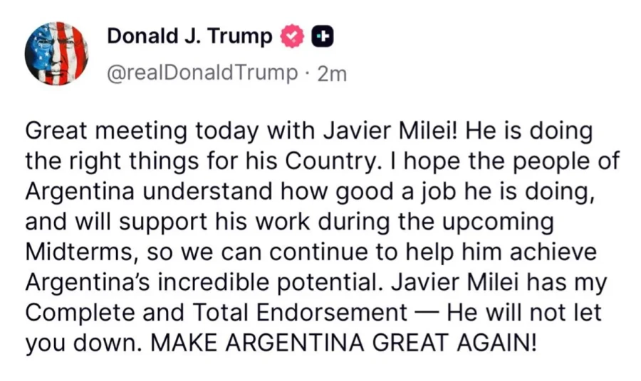El posteo ratifica el fuerte alineamiento político e ideológico entre ambos mandatarios, y se suma a las advertencias que el propio Trump había realizado durante el encuentro, donde condicionó la continuidad de la ayuda financiera de Estados Unidos a un resultado favorable para La Libertad Avanza en los comicios del 26 de octubre.