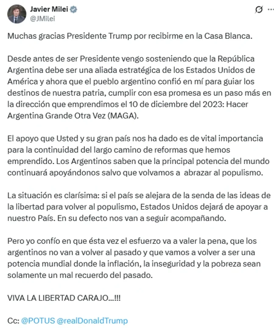 "Muchas gracias Presidente Trump por recibirme en la Casa Blanca", comenzó Milei su posteo en la red social X. Allí, reafirmó su promesa de campaña de convertir a Argentina en un "aliado estratégico" de Estados Unidos, un paso que consideró fundamental para "Hacer Argentina Grande Otra Vez (MAGA)", en un claro guiño al eslogan de su par norteamericano.