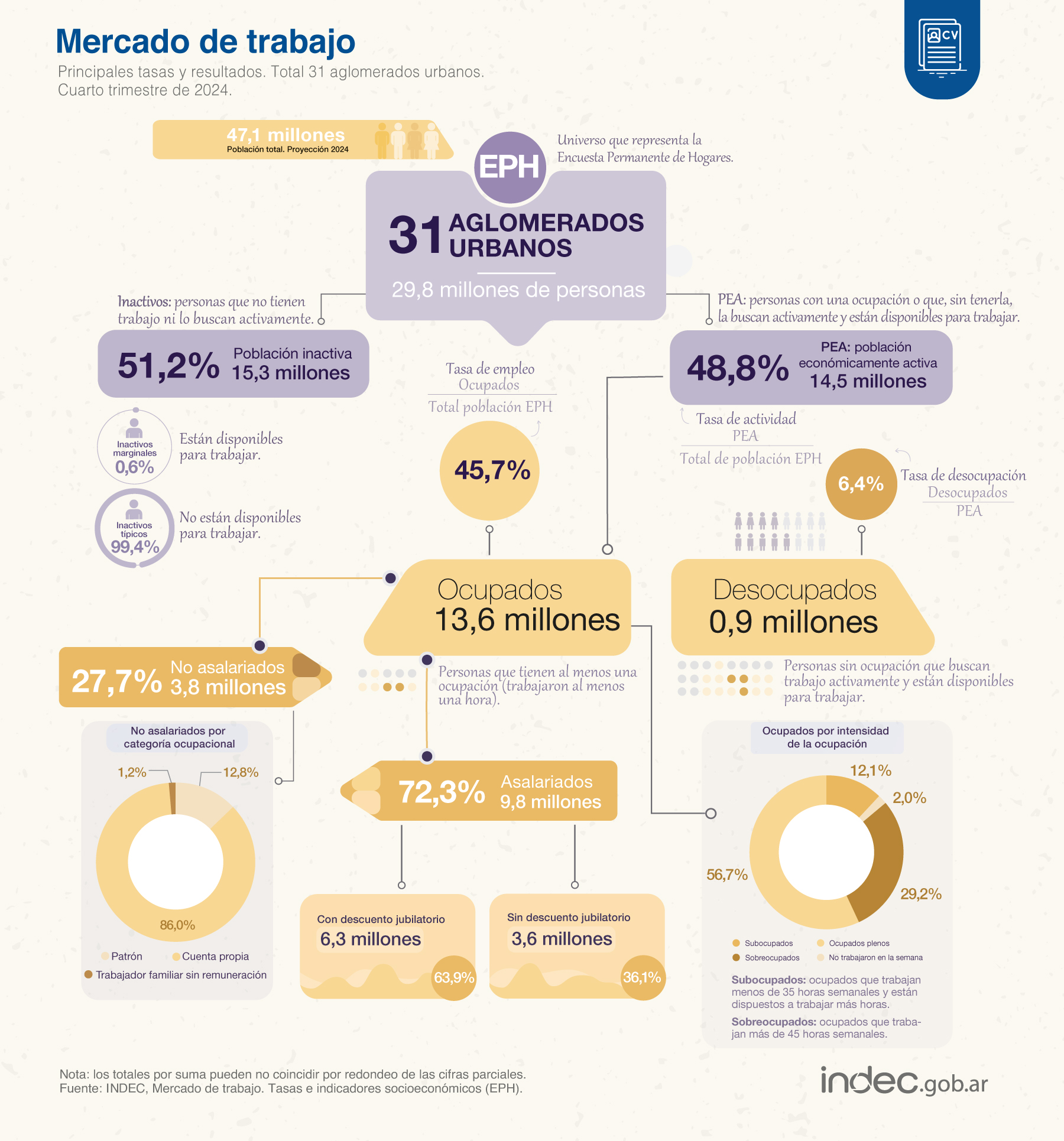 En el cuarto trimestre de 2024, la tasa de desocupación en los 31 aglomerados urbanos de Argentina se ubicó en 6,4%, lo que representa una suba de 0,7 puntos porcentuales en comparación con el mismo período del 2023 (5,7%).