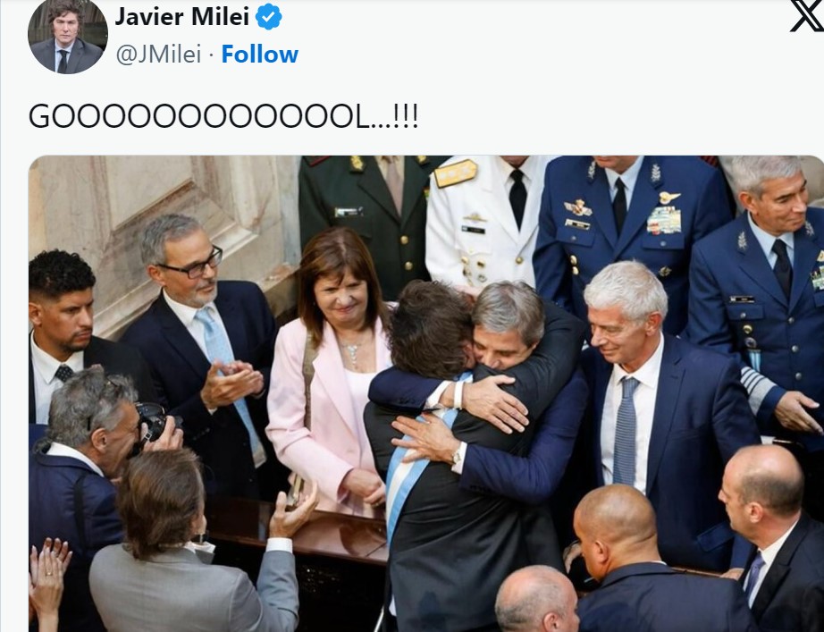 GOOOOOOOOOOOOL...!!!”, publicó en redes sociales el presidente Javier Milei y compartió una foto donde se lo puede ver abrazando al ministro de Economía, Luis Caputo, en una fuerte señal de respaldo a la gestión del titular de Hacienda.