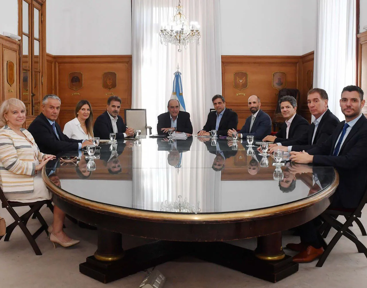 Diego Santilli, Silvia Lospennato, José Nuñez, Luciano Laspina, Silvana Giudici y Damián Arabia, visitaron al titular de la cartera y a su segundo, Lisandro Catalán, en el Salón de los Escudos para avanzar en la sanción de la ley que obsesiona a la administración libertaria. También estuvieron el asesor presidencial, Santiago Caputo, y el vicejefe de Gabinete, José Rolandi.