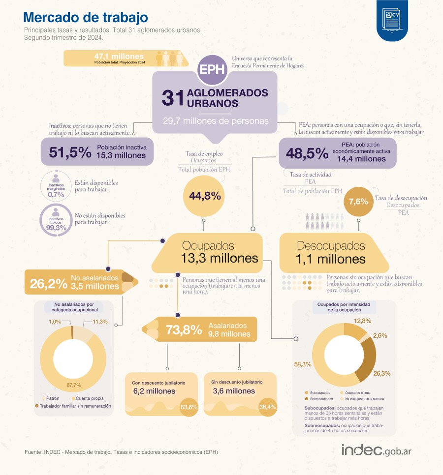 El Índice de Desocupación alcanzó el 7,6% al término del segundo trimestre del año, en línea con el 7,7% del primer trimestre, a pesar de que la economía entre ambas mediciones bajó el 1,7%, informó hoy el Instituto Nacional de Estadística y Censos (INDEC).